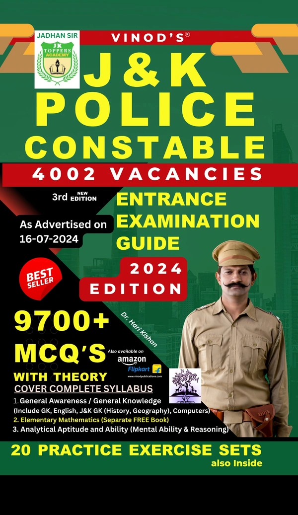 J&K POLICE CONSTABLE (4002 Vacancies) Entrance Examination Guide (9700+ MCQ's with THEORY) 2024 Edition - Vinod Publications Cover Complete Syllabus 1. General Awareness / General Knowledge 2. Elementary Mathematics 3. Analytical Aptitude and Ability ; Total 4002 Vacancies